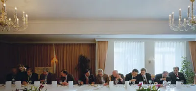 Une image de l’oligarchie : A Lunch at the Belvedere World Economic Forum, Davos, 22 color photograph, 53 1/3 x 114 1/3″ ; Janvier 2004