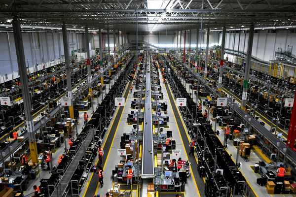 Un centre de travail discontinu, précaire et déshumanisant. Un des ateliers Amazon, une des firmes transnationales libertariennes aux mains des « gens de biens ». Ici, un entrepôt à Dortmund en Allemagne. ©Ina Fassbender/AFP